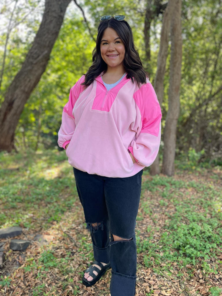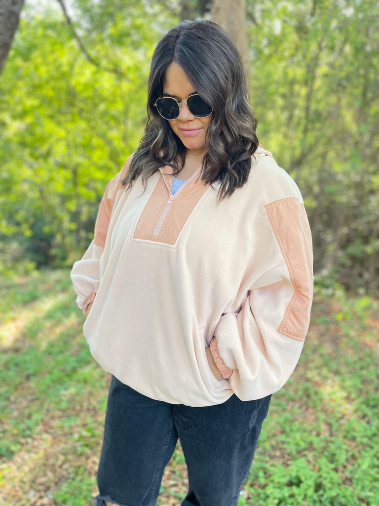 You can never have too many fleece jackets and the half zip + oversized hood makes this one a MUST! Super soft with a roomy fit and contrasting accent details.