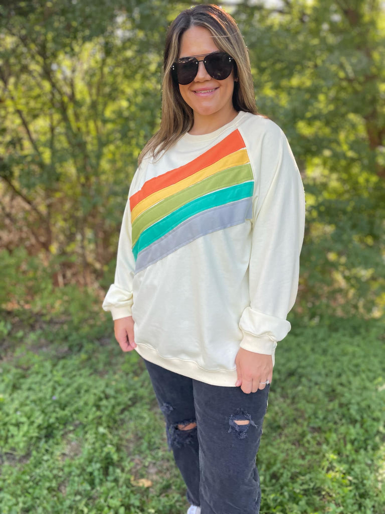 This rainbow pullover is giving us all the retro feels! We love the raw edge detailing of the stripe details, and the colors really pop on both the black and cream options. It's a medium weight french terry so will transition well between seasons.