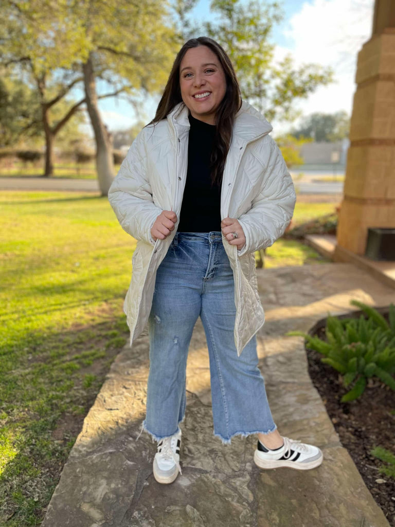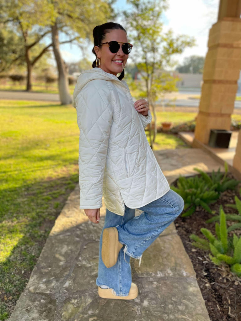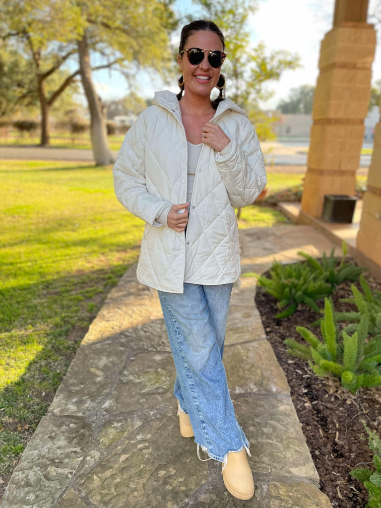 Stay cozy and comfy in this lightweight hooded puffer jacket. Featuring snap button closures, side slits and pockets!