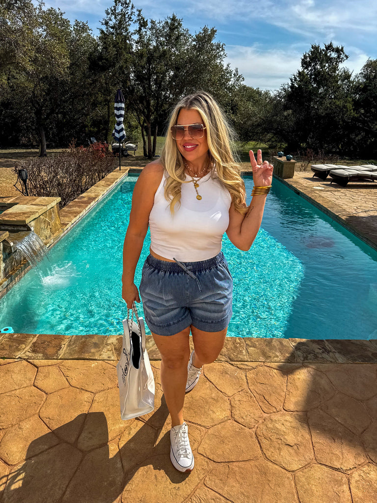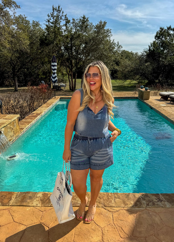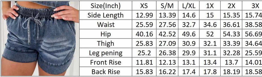 Designed with a comfortable elastic waistband and adjustable drawstring, these shorts offer a relaxed yet flattering fit. The lightweight, soft denim jogger style stretchy fabric features a subtle faded wash, adding the perfect vintage touch to your wardrobe.
