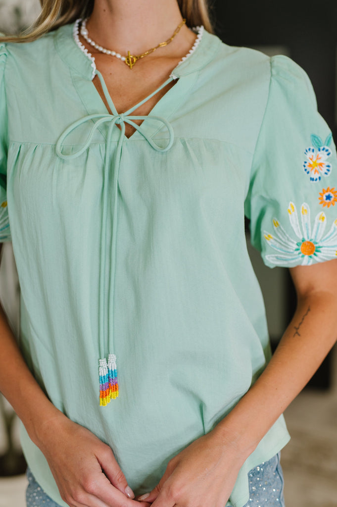 PREORDER: Embroidered Puff Sleeve V-Neck Blouse in Aqua