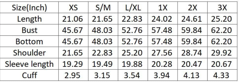 Sizing:
