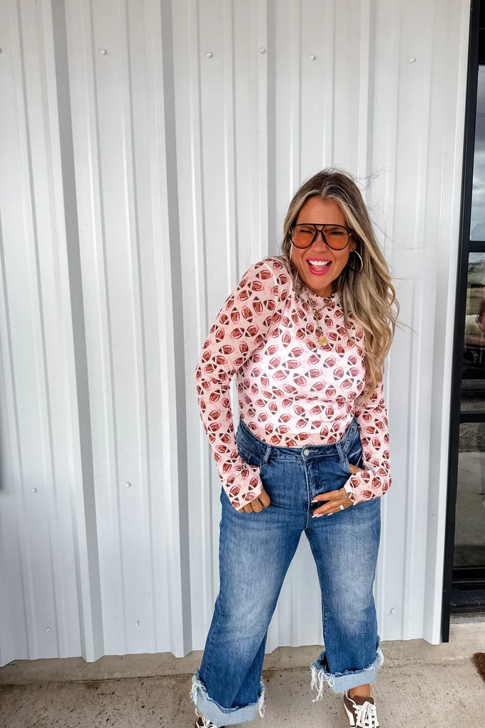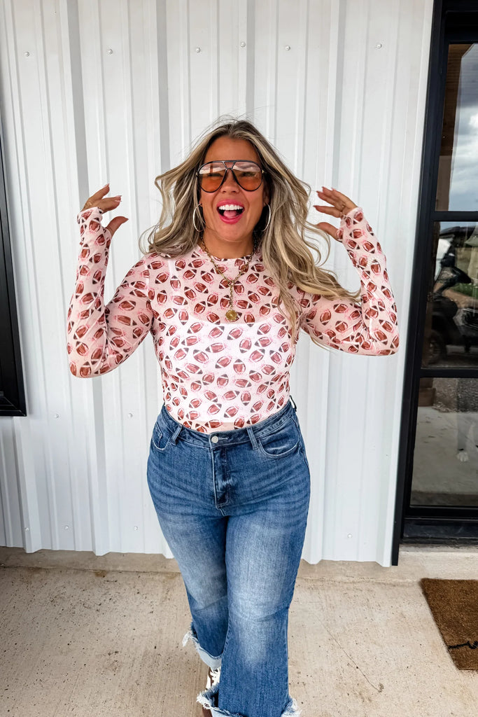 OUR FOOTBALL PRINT IS HERE!! Super cute for layering, this sultry stretchy mesh print long-sleeve top features a totally sheer design. Perfect worn alone or paired under your favorite cardigan, vest or sweater! Crew neck and thumbhole details.