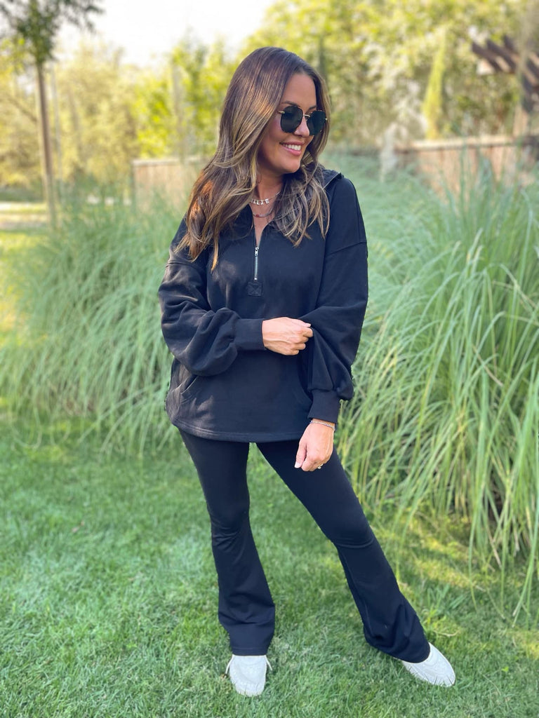 This oversized half zip hoodie will be on repeat all year long! The lighter weight makes it a versatile transition piece through any season and the relaxed fit keeps you feeling comfy with denim or leggings. Featuring a half zipper, kangaroo pocket, a drop shoulder design and oversized hood.