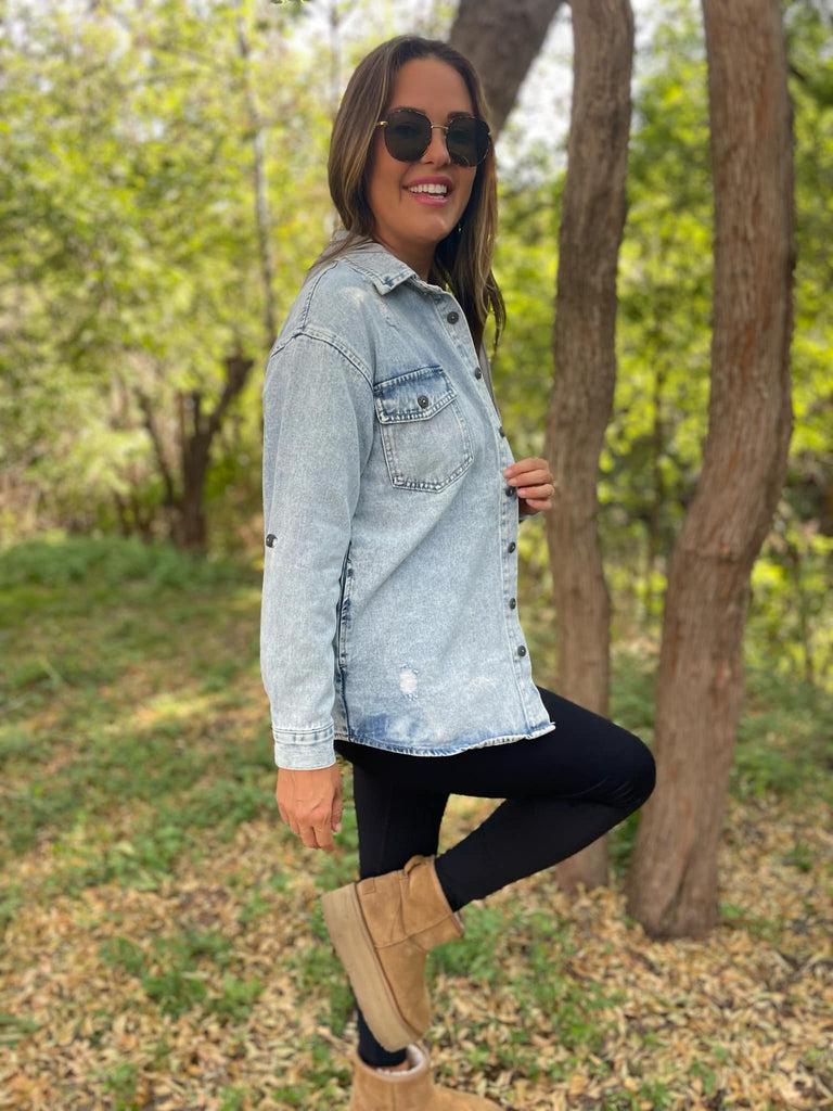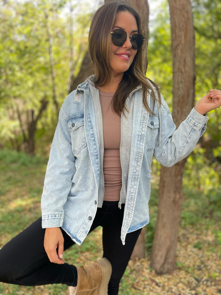 This hooded denim jacket gives the illusion of layering without the extra bulkiness. With a gorgeous light wash and just enough distressing to give it a lived in feel, it has a button closure with pockets and an oversized hood.