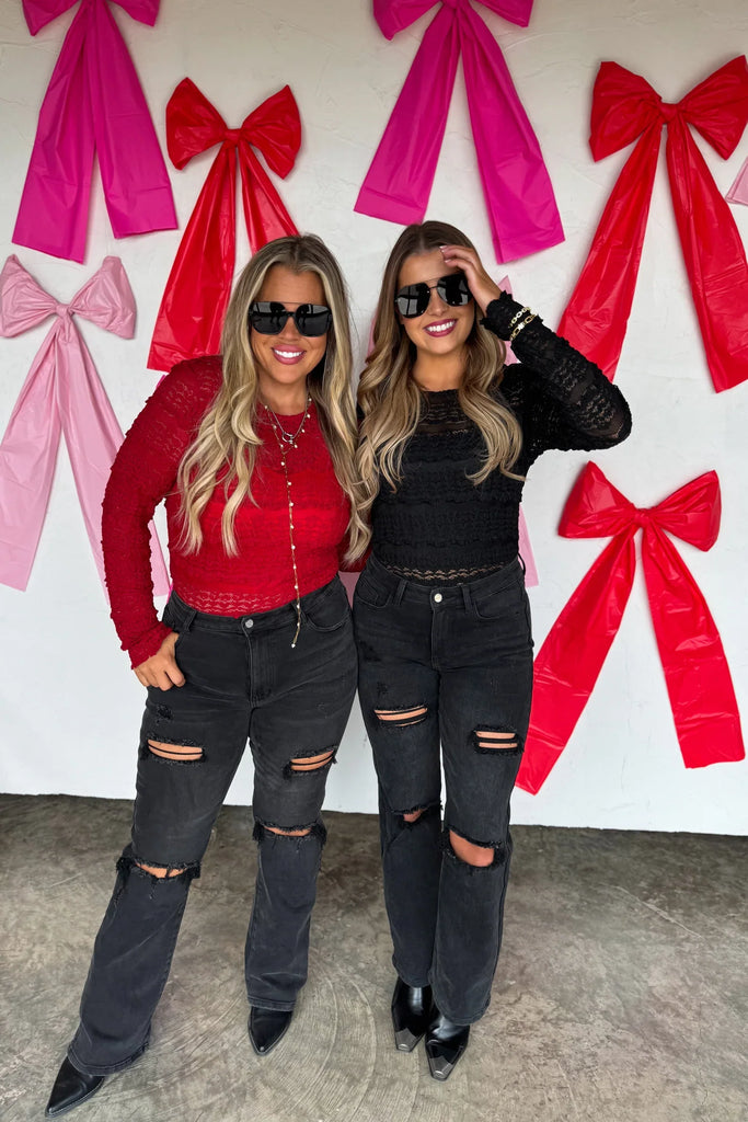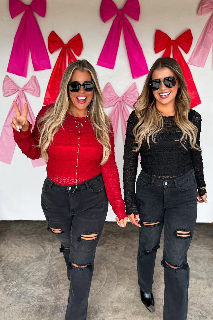 Feminine, flirty, and effortlessly chic—this lace top features a sheer stretchy layered lace bodice sleeves and back. The fitted silhouette hugs in all the right places while still offering comfort and movement. Super cute for layering and perfect for dressing up denim or wearing under jackets — sweet, soft, and so versatile.