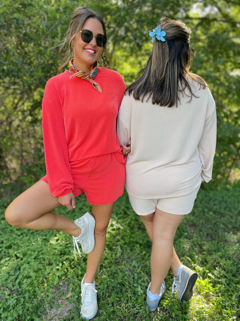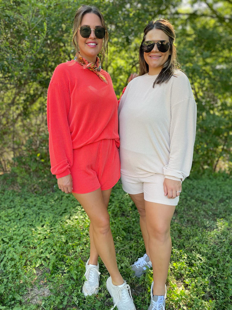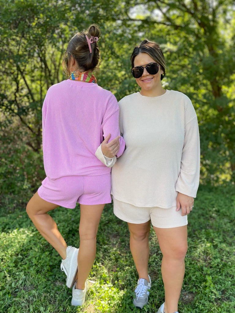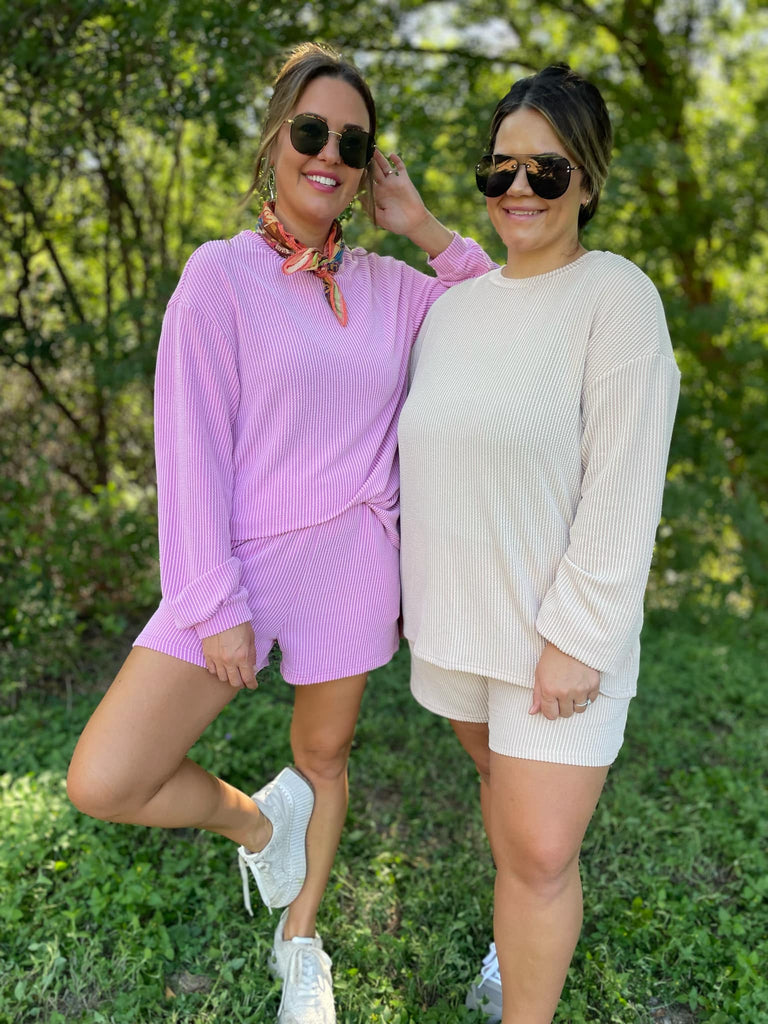 Our favorite ribbed fabric is back in three gorgeous colors for this chic lounge set. The shorts have a comfortable elastic waistband with pockets and we love the drop shoulder detail of the top!