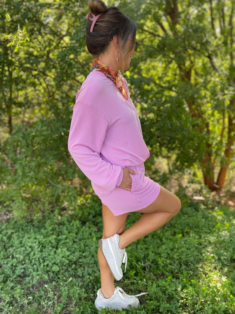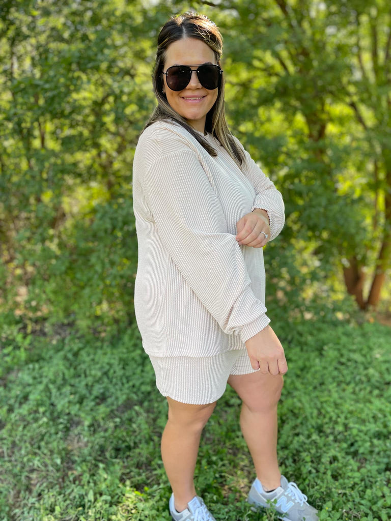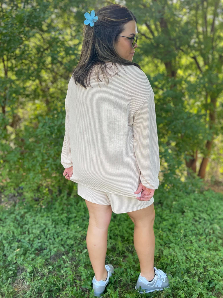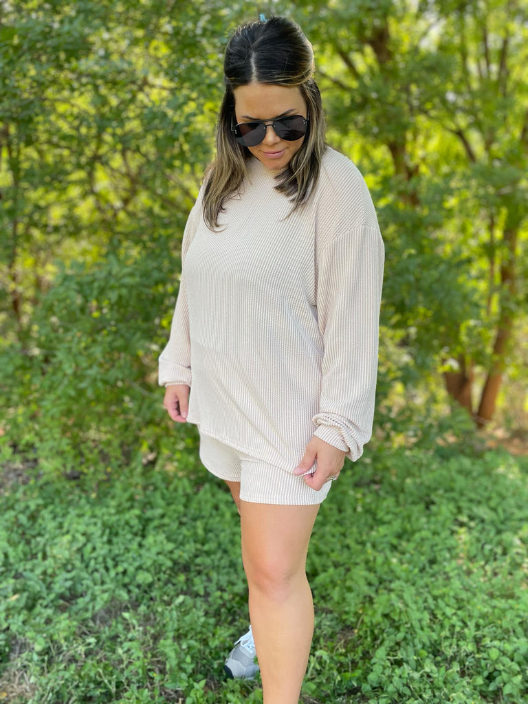 Our favorite ribbed fabric is back in three gorgeous colors for this chic lounge set. The shorts have a comfortable elastic waistband with pockets and we love the drop shoulder detail of the top!