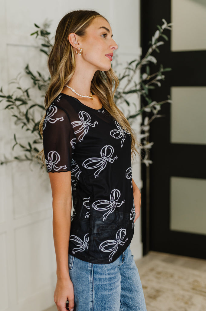 Add a flirty edge to your outfit with this Sheer Bow Layering Top. Made from high-stretch mesh, it features a banded crew neckline and playful cap sleeves. Its lightweight, see-through design makes it perfect for layering, adding texture and fun to any look.