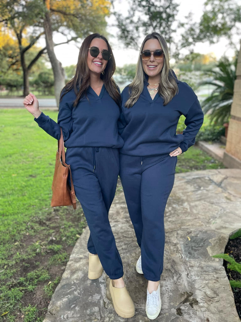 This pullover and jogger set are perfection worn together or as separates. The top features a v-neck with a collar and pockets! The bottoms feature an elastic waist with drawstring tie and (more) pockets! In a comfortable, relaxed fit and gorgeous neutral navy it's a go-to for running errands or lounging!