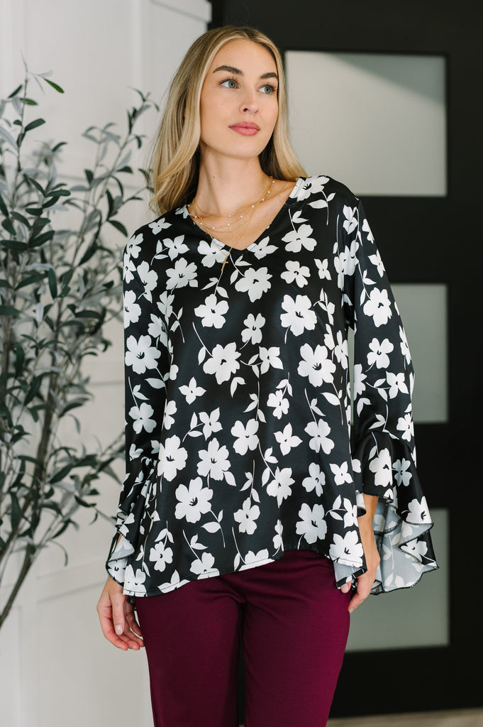 Add a touch of whimsy with the Time and Time Again Bow Detail Blouse. Crafted from smooth poly satin with just a hint of stretch, it features a flattering V-neckline and playful ruffled sleeve cuffs. The gathered back seam adds subtle texture, while the relaxed fit keeps you comfortably stylish from day to night.